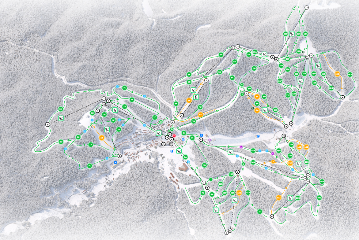 • klasyfikacja tras: niebieskie, czerwone, czarne, trasy sportowe dla slalom gigant i mogula